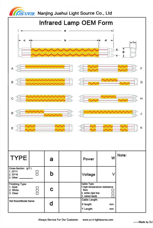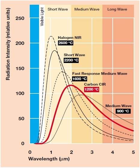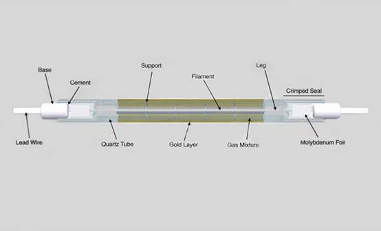 IR heating lamps from Nanjing Juehui Light Source Co., Ltd cover the whole IR range. infrared short wave (SW), infrared fast response medium wave (FMW), infrared medium wave (MW), infrared carbon medium wave (CMW). Choosing the correct spectrum for your production can give you shorter heating time, higher production rate, and more energy savings.